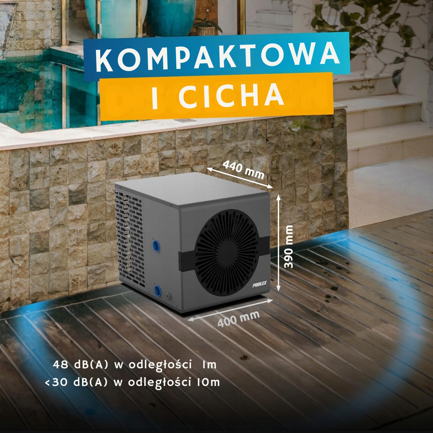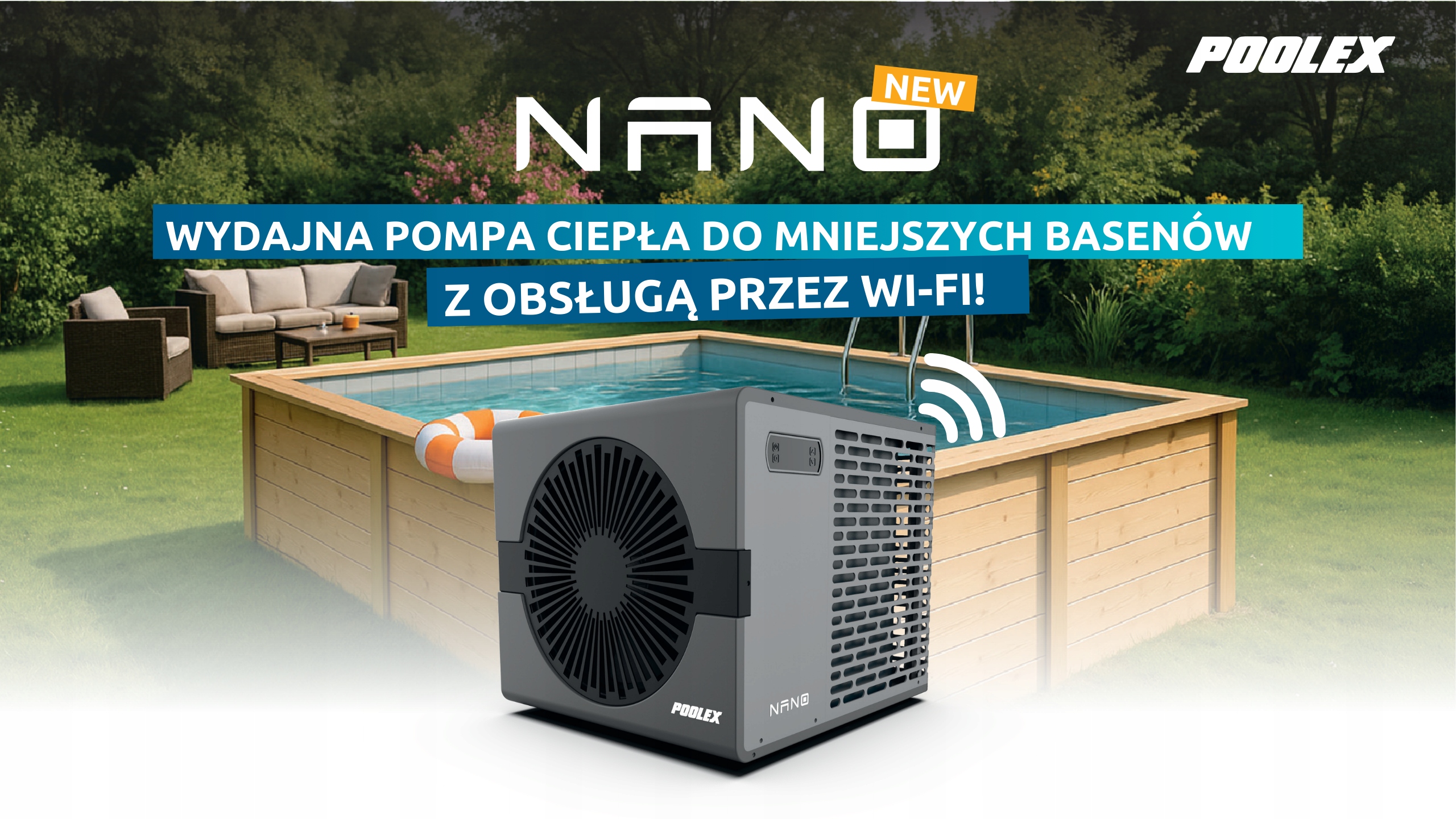 Model NANO zachowuje niewielkie wymiary mimo większej mocy. Ułatwia to montaż w ogrodach, gdzie przestrzeń techniczna jest ograniczona. Urządzenie może być ustawione blisko strefy basenowej bez potrzeby wydzielania dużej instalacji technicznej.